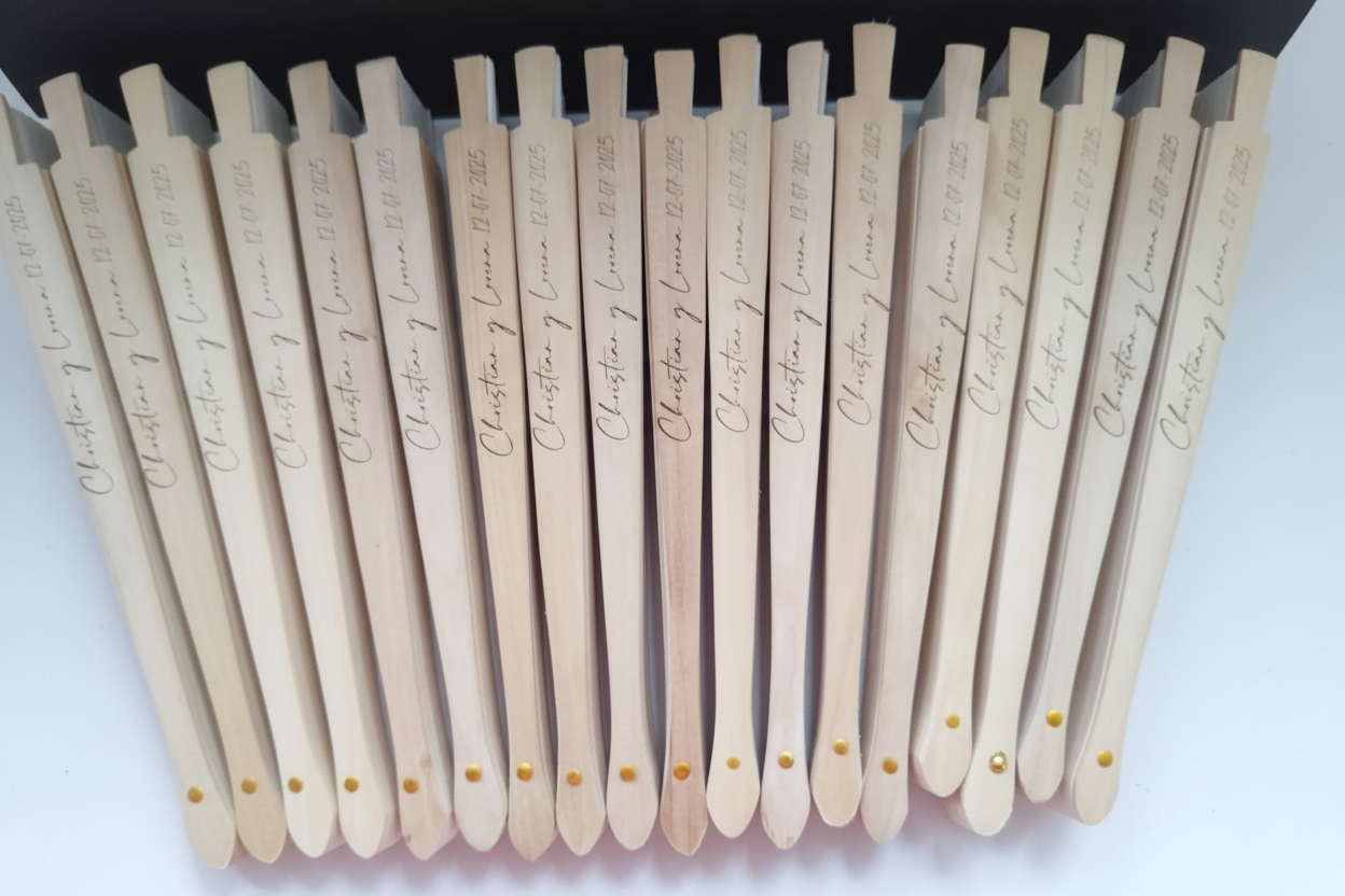 Este abanico personalizado se graba a láser en la varilla con nombres, fecha del evento o un pequeño texto, logrando un acabado fino, duradero y lleno de significado. Su diseño en madera natural y algodón lo convierte en un detalle sencillo, natural y muy especial.