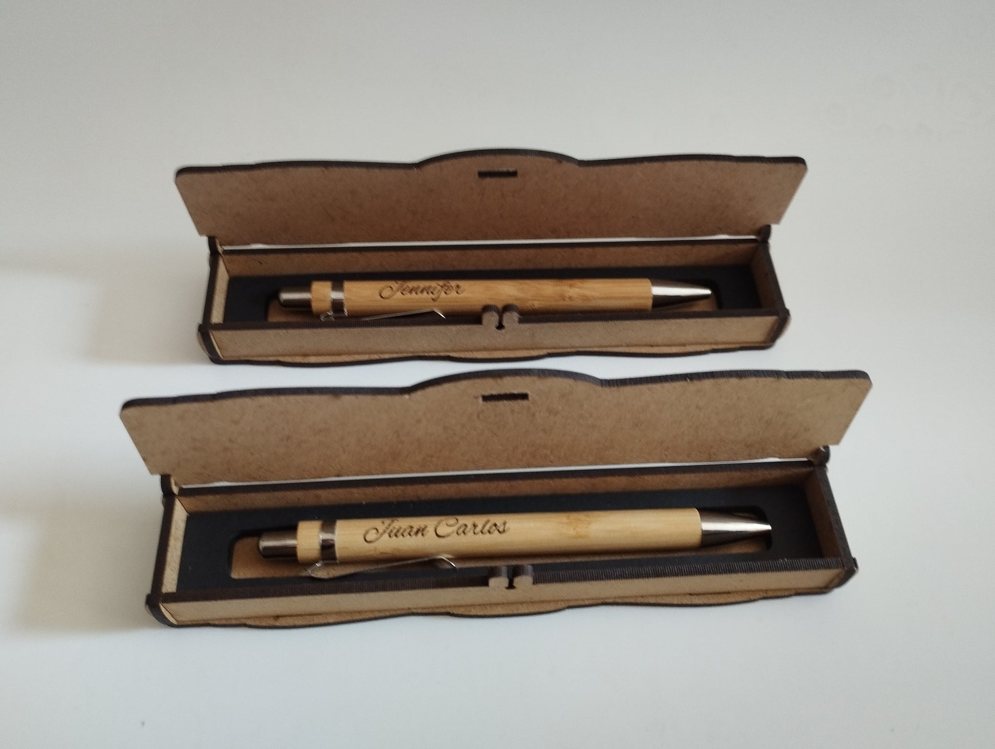 Nuestros bolígrafos personalizados, presentados en un estuche de madera grabado, son el regalo perfecto para agradecerles que formen parte de vuestro gran día.
