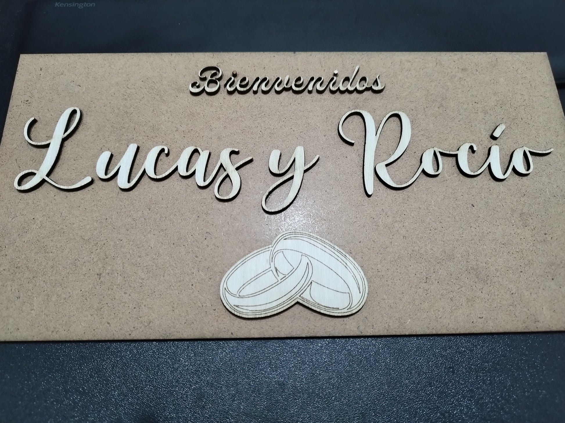 Material: DM de 5 mm en la base, contrachapado de 3 mm para la letras.