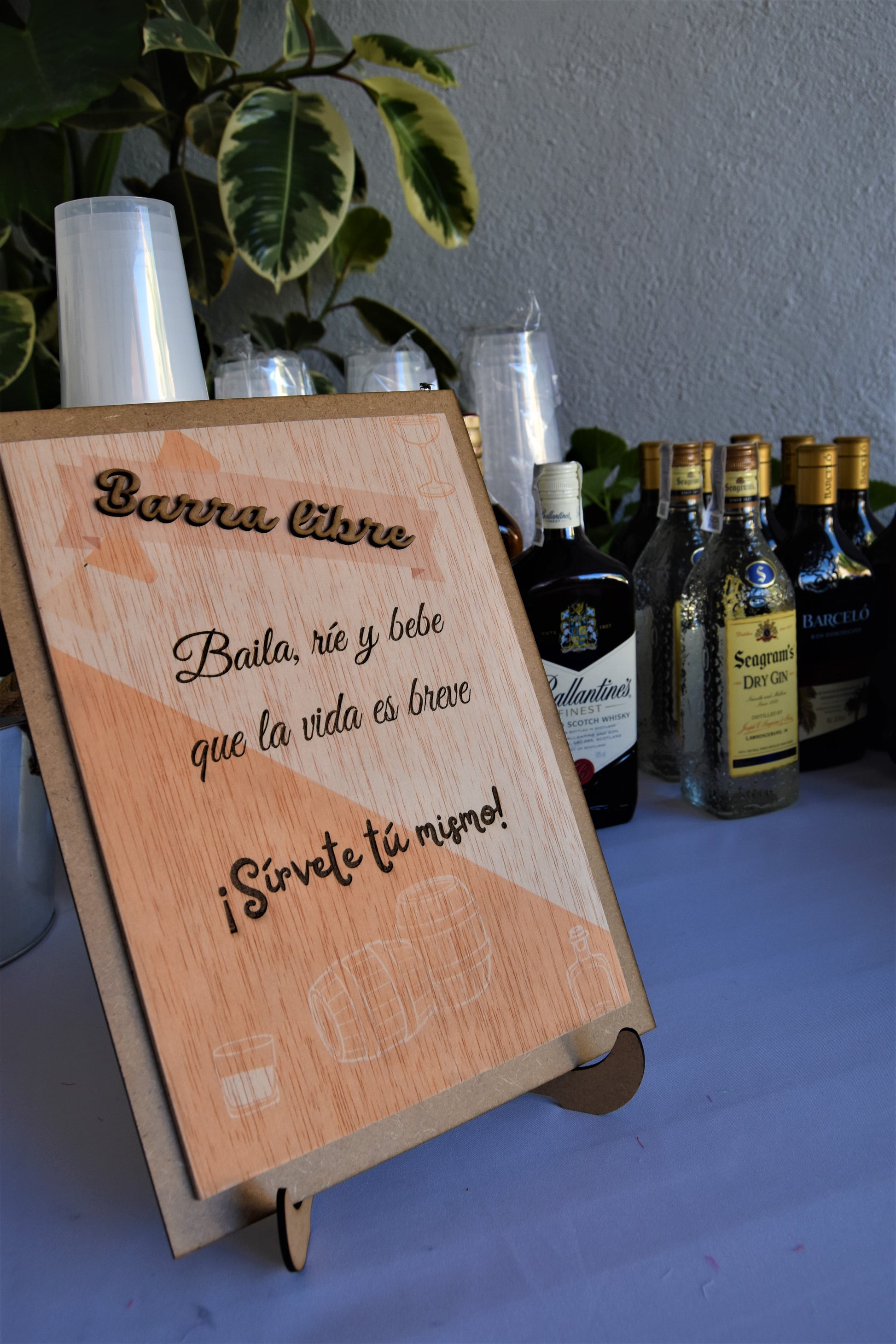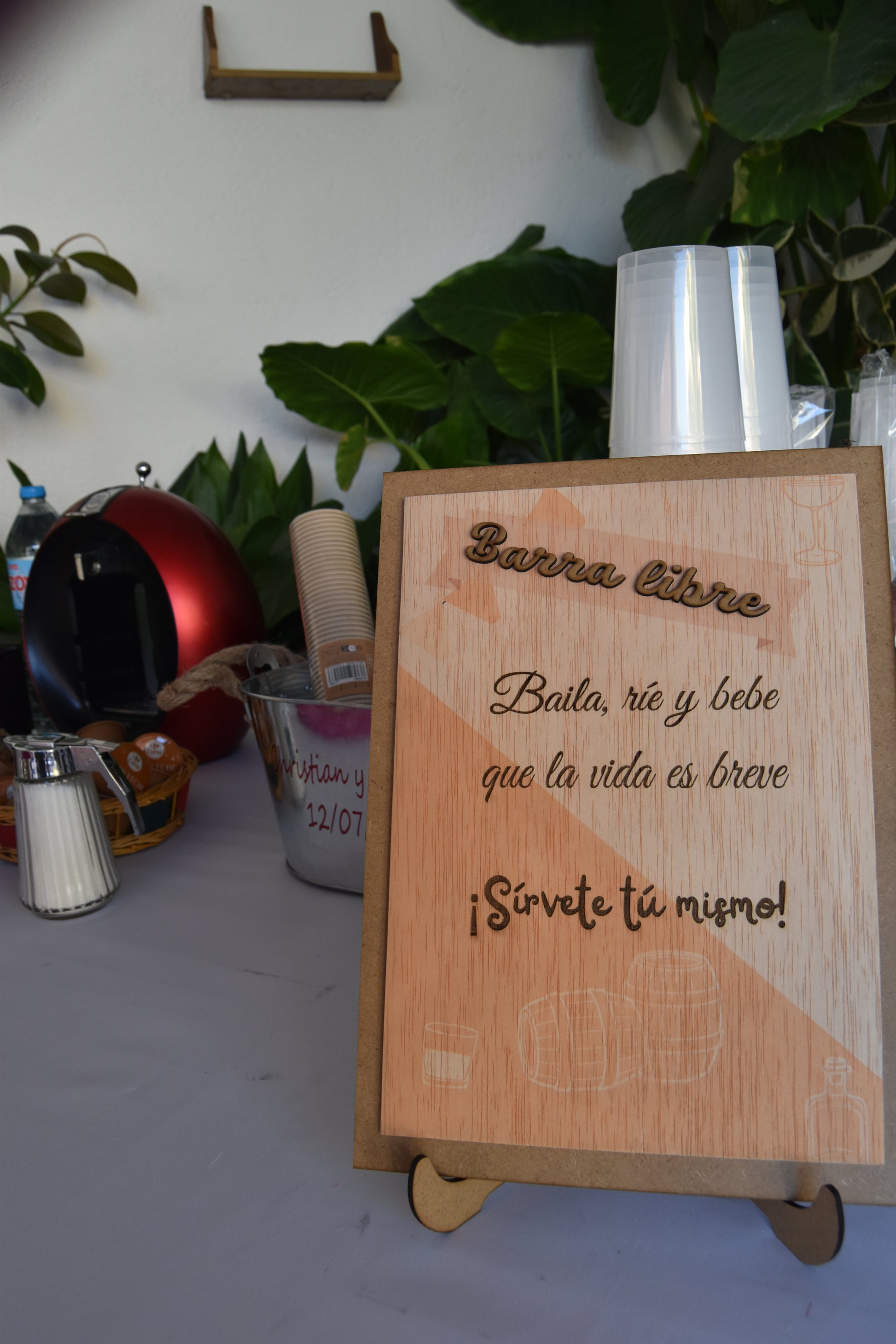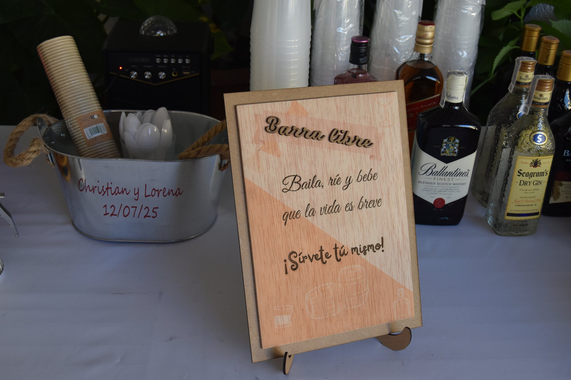 Ideales para señalizar rincones especiales como el candy bar, la barra libre, el photocall o la mesa de regalos 🎁, cada cartel está elaborado en madera natural y se personaliza con nombres, fechas o el mensaje que más te guste.