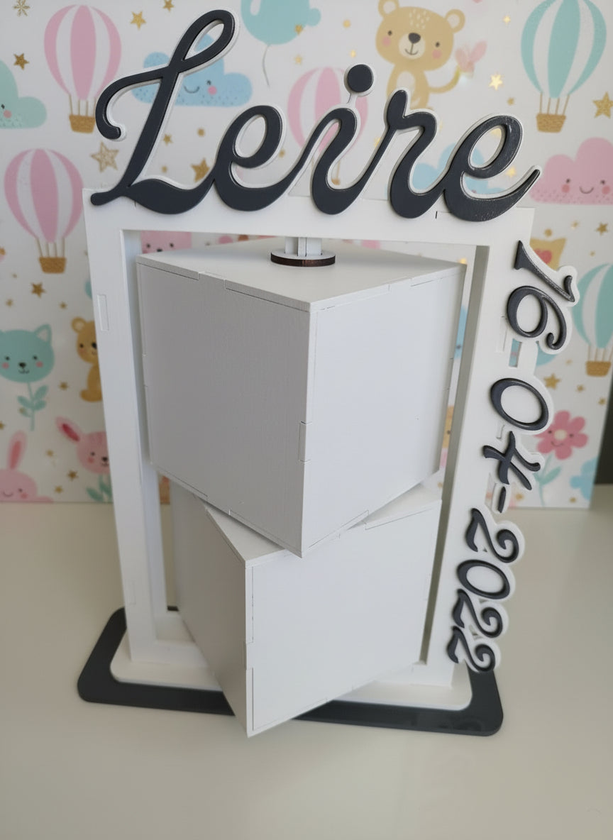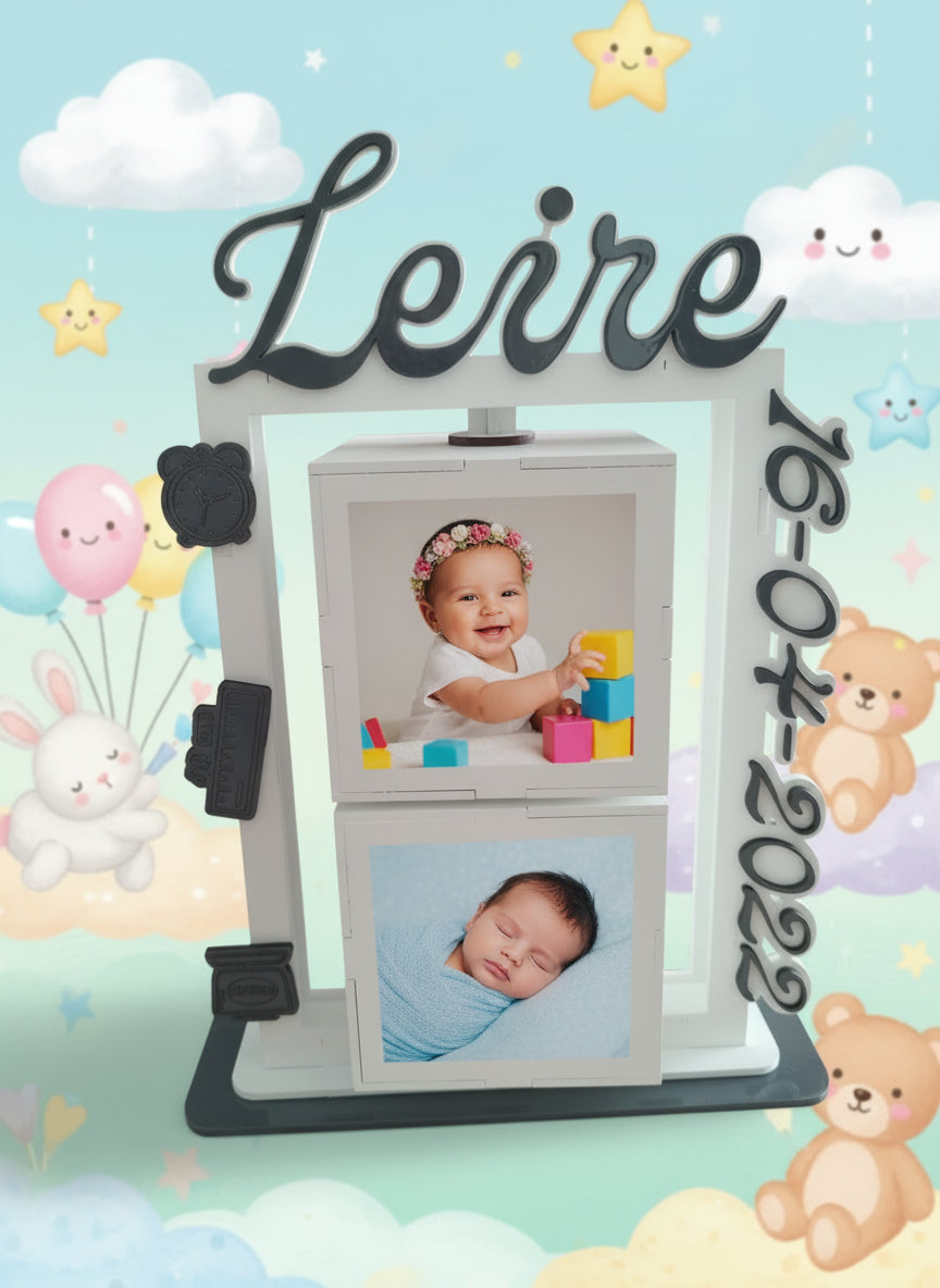Descubre nuestro marco de fotos giratorio personalizado, diseñado para mostrar hasta 8 de los momentos más especiales de tu pequeño. Cada detalle cuenta: su nombre y su fecha de nacimiento hacen de este marco un regalo único y lleno de cariño.