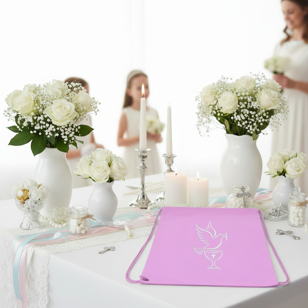 Cuenta con cuerdas de autocierre a juego y un diseño ligero y práctico, perfecta para bodas, comuniones, bautizos, ferias o acciones promocionales.